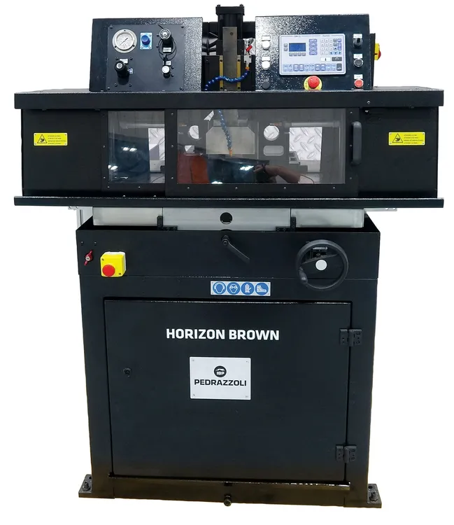 Pedrazzoli Semiautomatic Circular Upcut Saw with hydraulically fed upcut blade movement designed to quickly and accurately produce straight and miter cuts in a wide range of profile and solid materials. A testament to engineering excellence, the HB450 semiautomatic machine accommodates circular saw blades up to an impressive 450 mm blade with up to 6-inch round profile capacity. The blade is powered by precision-ground and hardened helical gears, guaranteeing a uniform cutting speed for a wide array of tube and solid materials. Adapting to material specifics, the blade’s rotational speed is seamlessly adjustable through the inverter, effortlessly controlled from the machine’s panel.