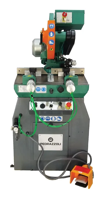 Pedrazzoli’s semiautomatic high-speed aluminum cutting circular saw improves productivity and cut quality while extending blade life. High-speed carbide tipped blade for accurate sawing of nonferrous tube and other light alloys. The saw head’s downward feed and return motions are customizable through pneumatic controls equipped with a brake for speed adjustment. Two pneumatic vises offer both lengthwise and lateral adjustments, ensuring steadfast material support throughout the cut and yielding immaculate, burr-free parts.